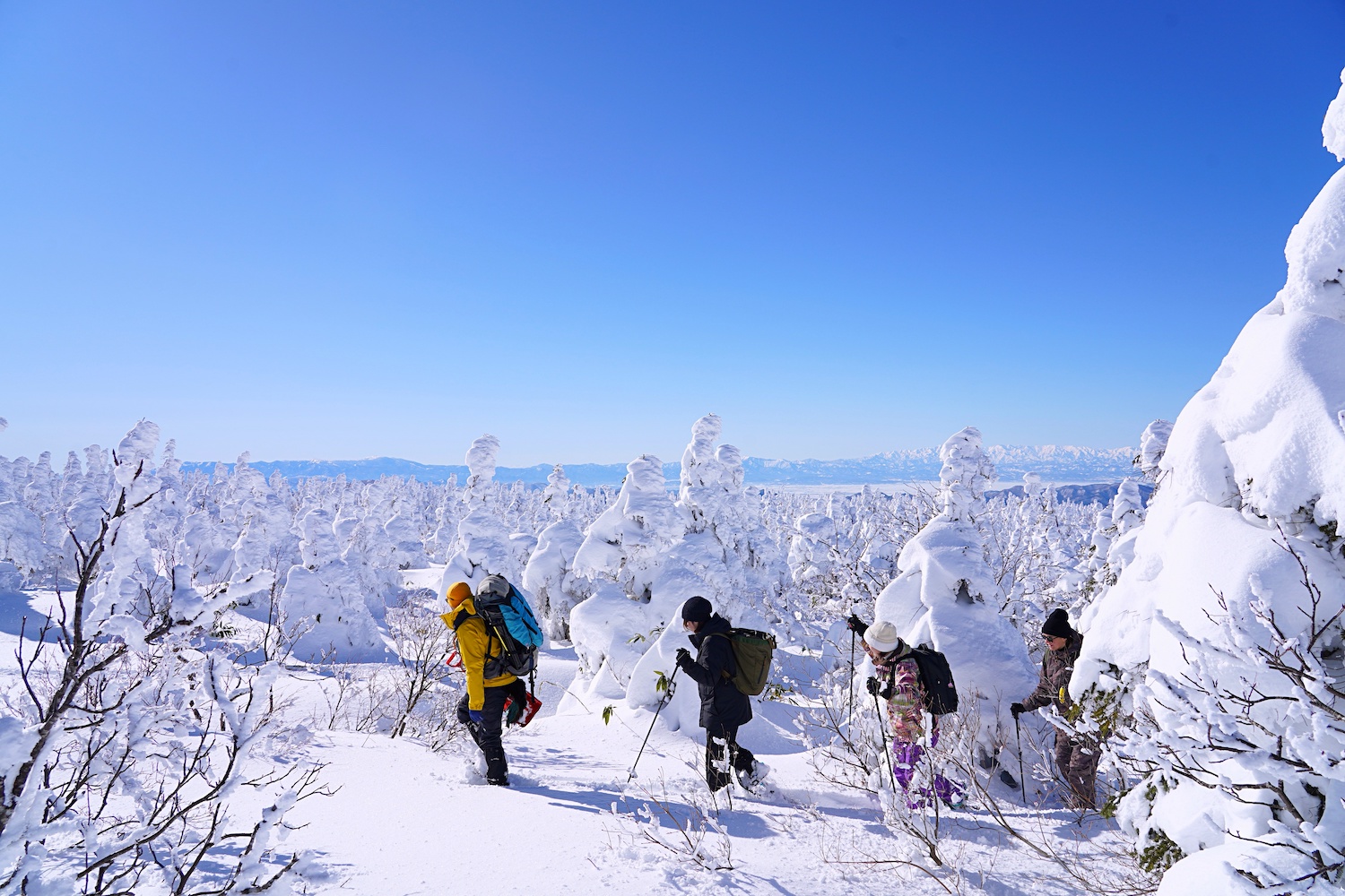 This is a snow hiking tour where you can witness Yamagata’s iconic winter scenery — the Zao “Ice Monsters” — up close.