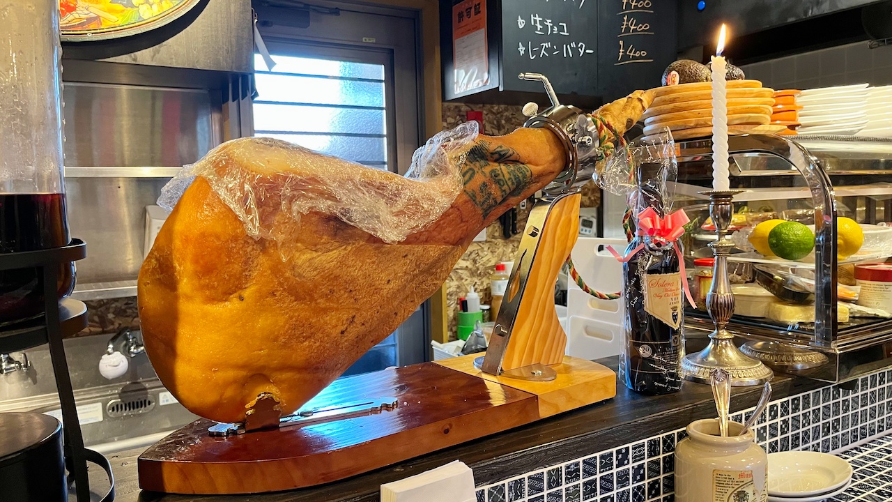 店内に入ってまず気になるのは、生ハムの原木!この原木は、水分が抜けて固くなった豚の足で、見た目が木のようなので原木と呼ばれるようになったそうです。