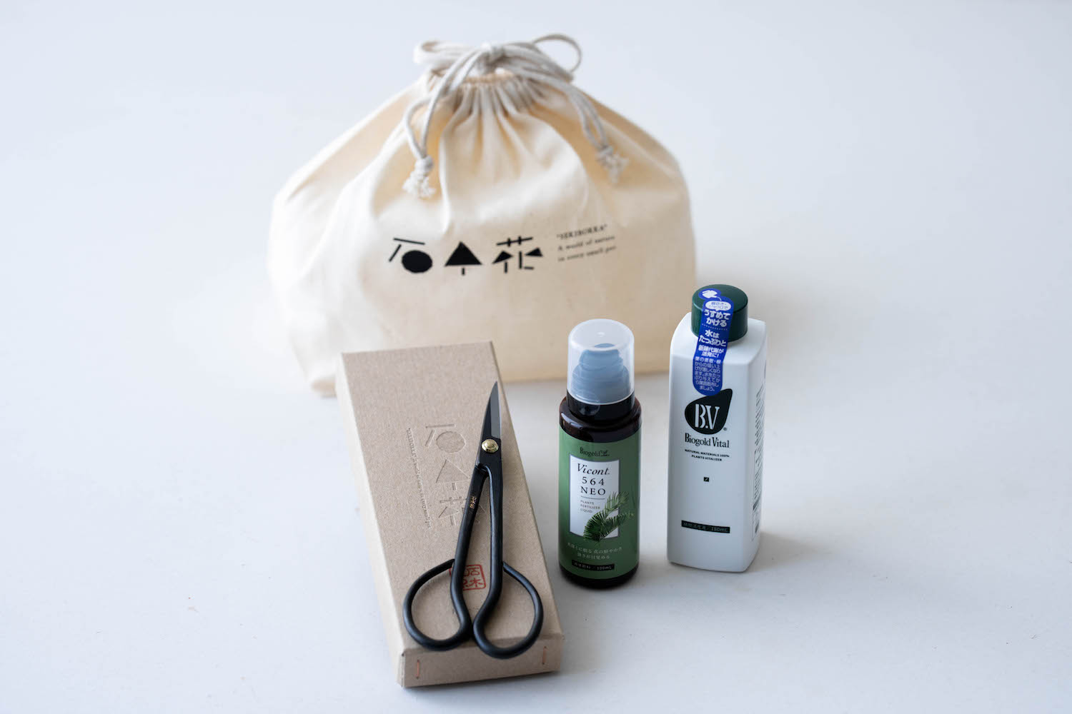 有料オプションで、剪定する時に便利な鋏と、日々のお世話に欠かせない肥料と活性剤をセットにして石木花オリジナル巾着袋に入れてご用意しました!盆栽入門者は、ぜひこちらのセットも合わせてご利用ください。