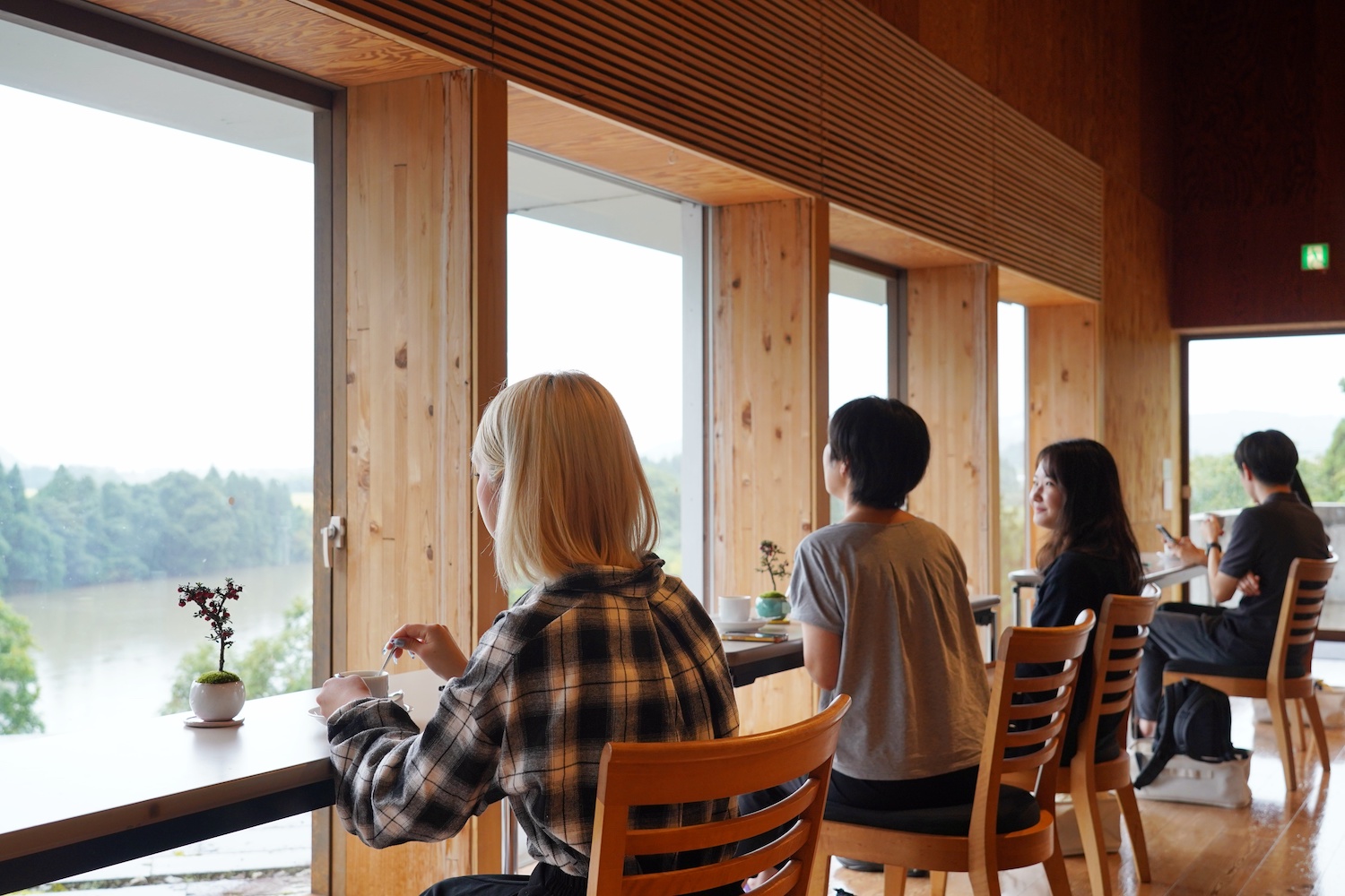 ここで「無のお時間」です。遠方に広がる最上川の絶景と、ご自身の盆栽を重ね合わせながら、自分だけの絶景時間をゆったりとお過ごしください。