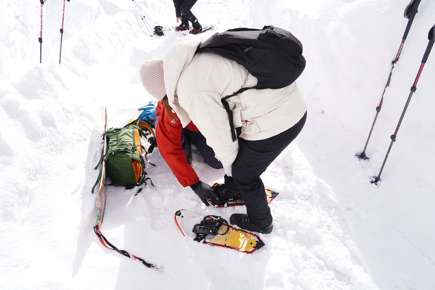地域の方のご協力で、特別に登り口近くに車をとめさせてもらい、スノーシューを履きます。そこから雪山の別世界へ!スノーシューさんぽのはじまりです。雪の上をスノーシューで歩くのでふわふわした感覚も楽しめます!